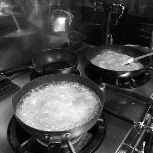 一人の料理人に対して多すぎるフライパンの数。