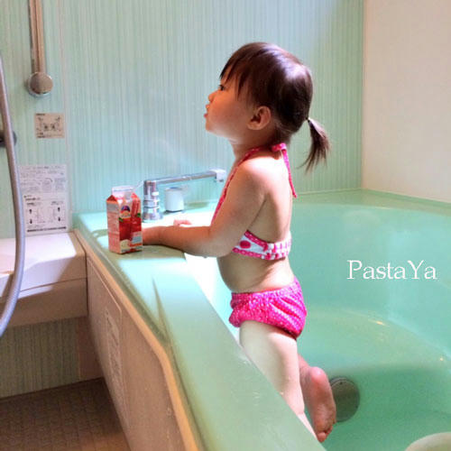 娘は水が大好き。(お風呂の温度でお湯を入れました)