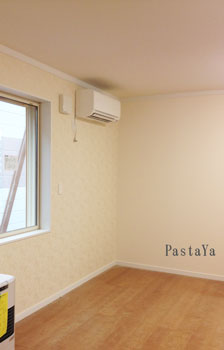 エアコン側の壁が、アンティーク調の柄になっています