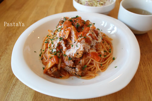 そしてPastaYaのトマトソースに、仕上げの少量の生クリームがまた、ポイントです。
