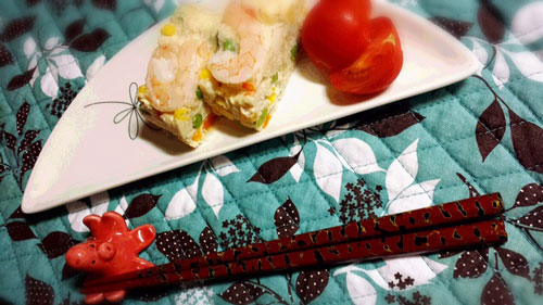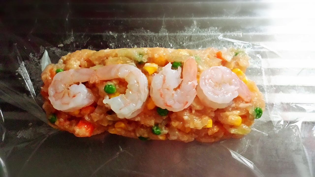③粘りがでるくらいになったら、ラップの上で成形しお好みで上にエビを飾ります(画像)