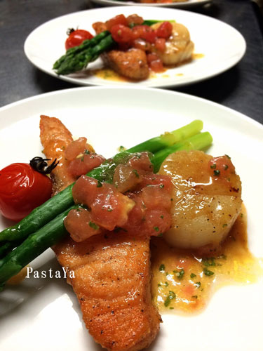 お魚料理のサーモンとホタテのムニエル