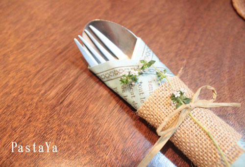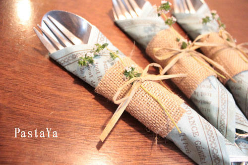 ペーパーナフキンと麻でカトラリーをくるりと。