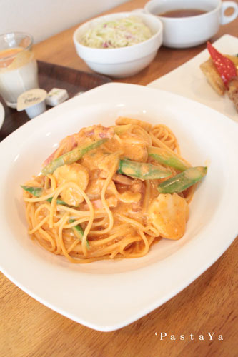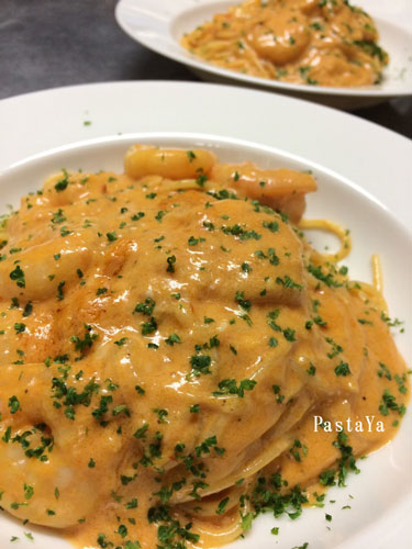 パスタはエビのトマトクリームパスタ